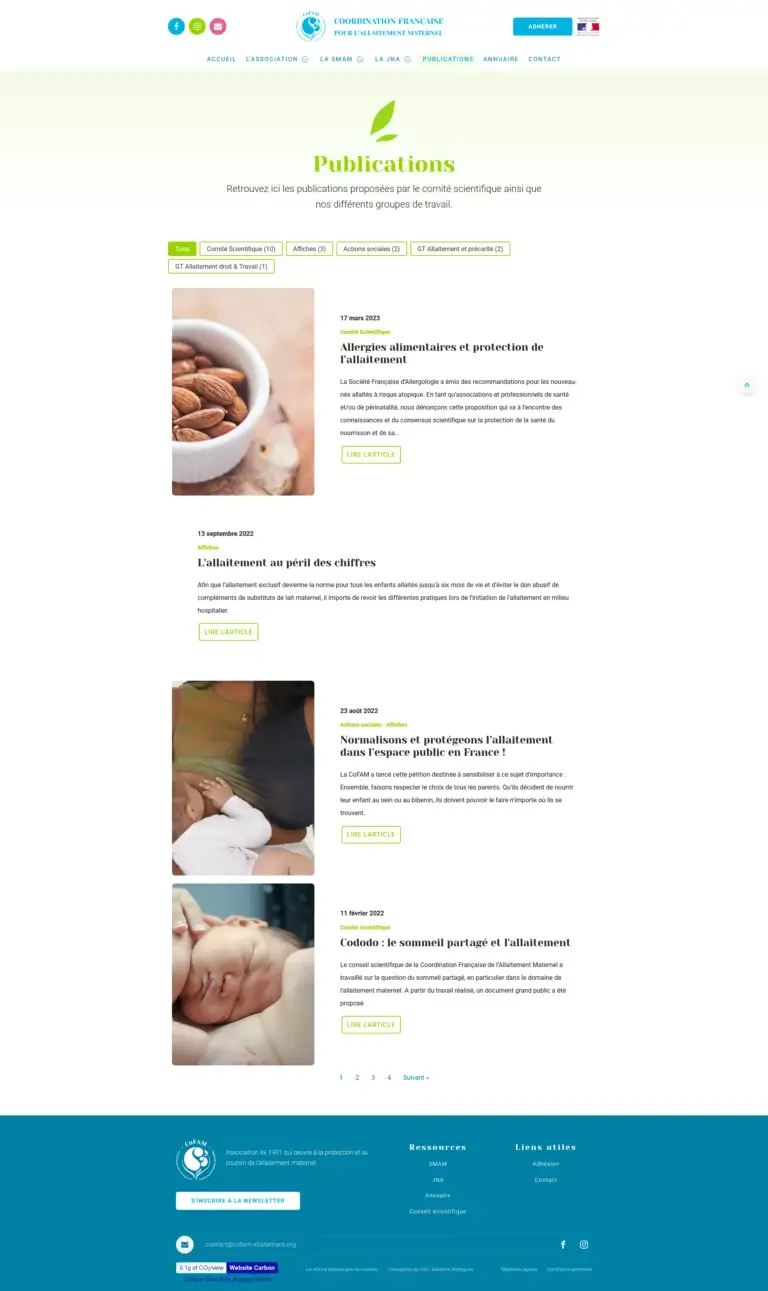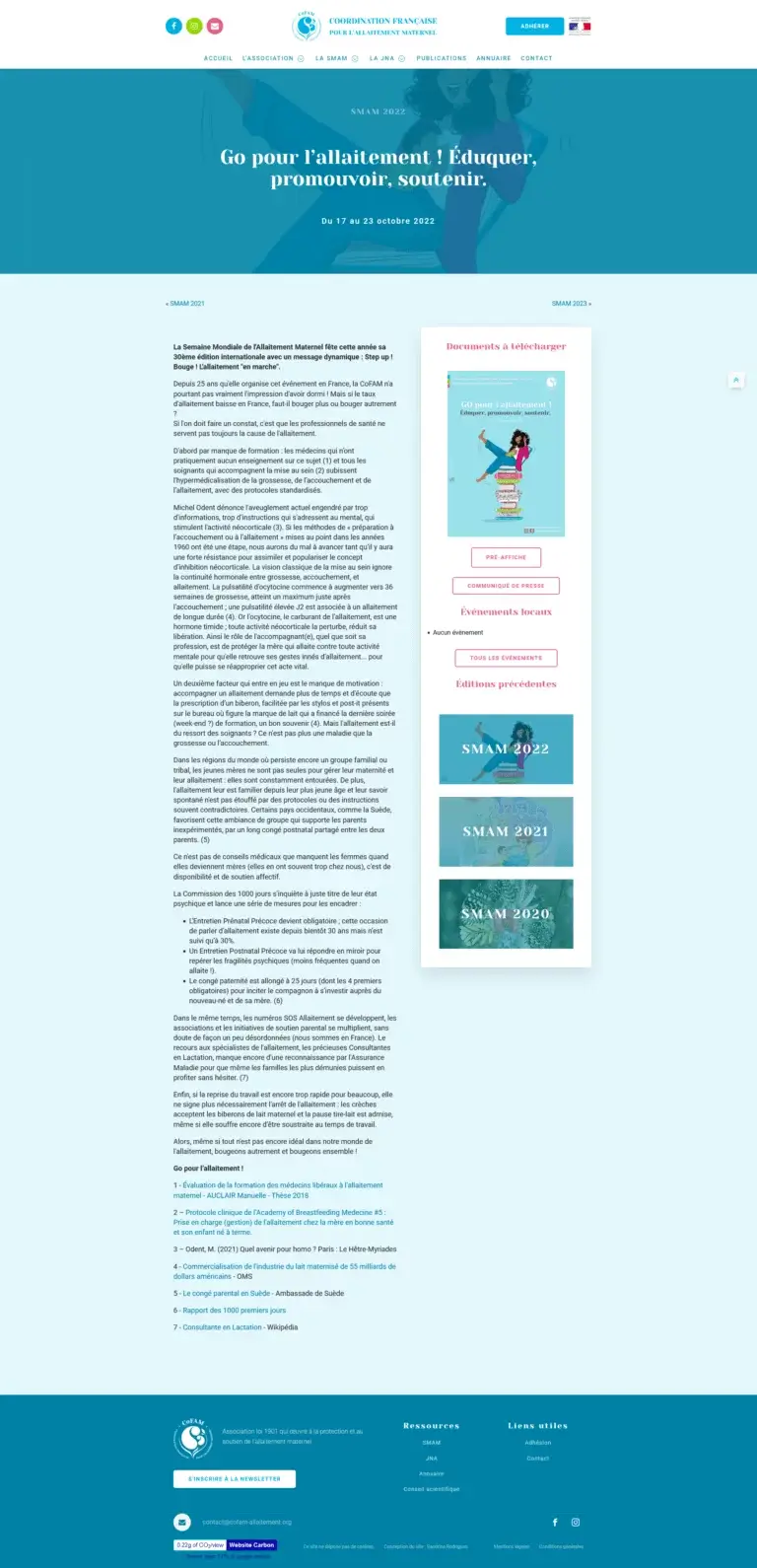 Celle-ci organise chaque année la Semaine Mondiale de l’Allaitement Maternel : le site est maintenant doté d’un outil permettant d’afficher la carte des événements organisés sur tout le territoire français dans le cadre de la SMAM, chaque événement pouvant être saisi par les participants. Un annuaire a par la suite été rajouté, permettant à toute structure adhérente de la CoFAM d’y apparaître.